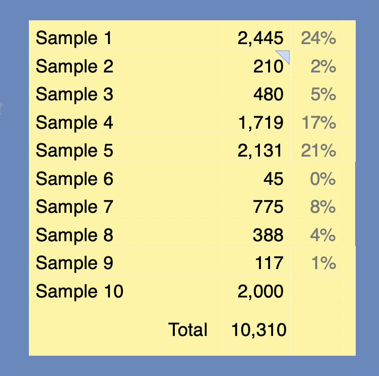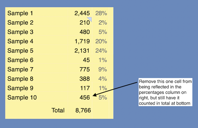 I have this spreadsheet set up so that the third column shows what percentage of the total each of the Samples is. I now want to remove the percentage formula from one cell only (the 456 in the Sample 10 row). I'm very poor at Numbers formulae and can't figure out how to do this. Can anyone help?