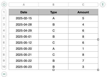 =SUM(FILTER(Data::C, MAP(Data::A, Data::B, LAMBDA(date, type, IF(AND(date≥DATE(2025,4,28), date≤DATE(2025,5,20), ISNUMBER(MATCH(type, {"A","B"},0))), 1, 0))), 0))