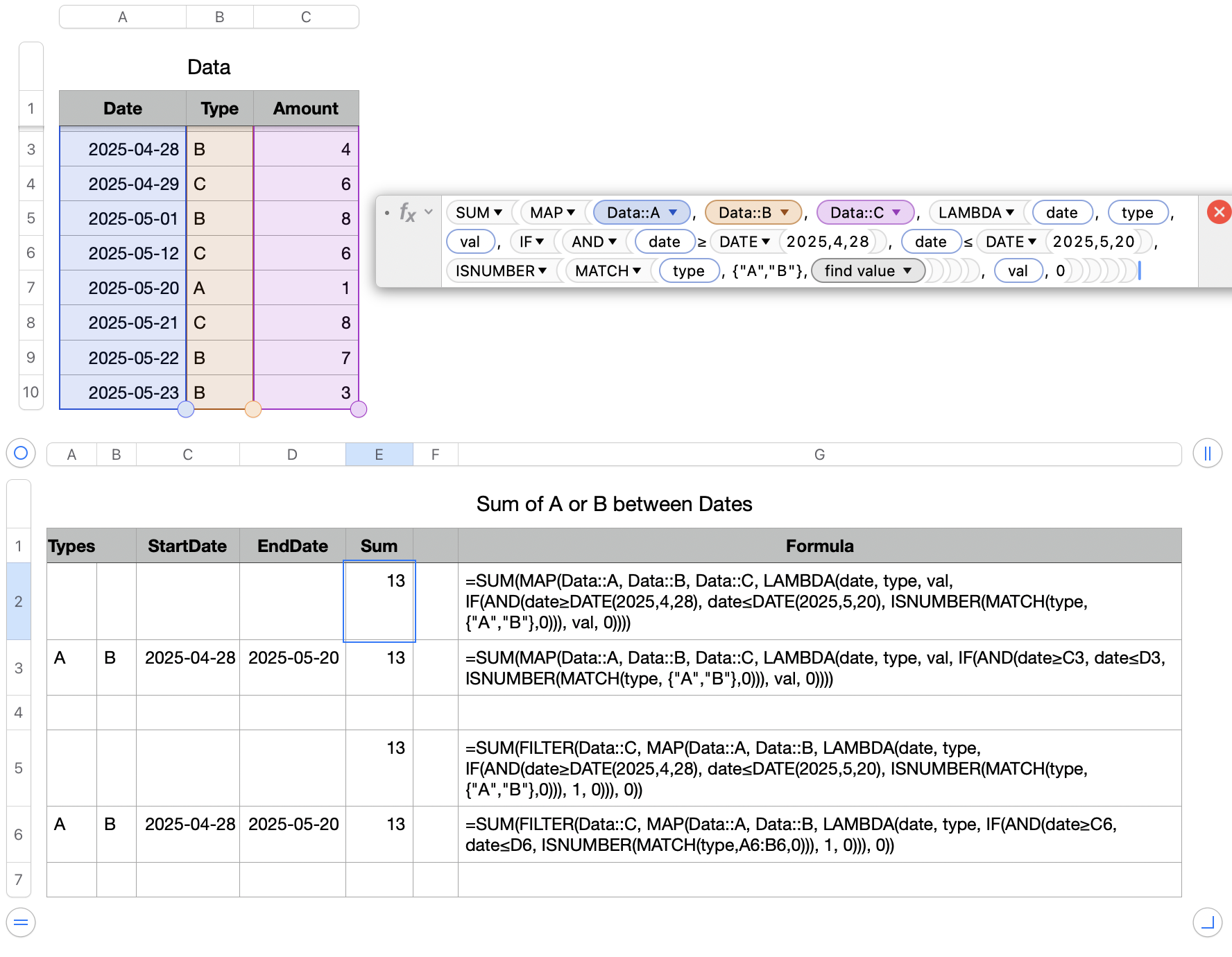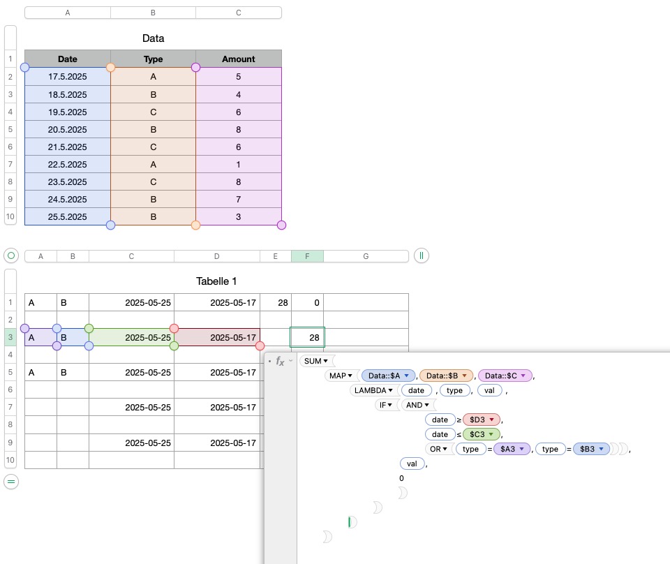 =SUM(MAP(Data::A, Data::B, Data::C, LAMBDA(date, type, val, IF(AND(date≥DATE(2025,4,28), date≤DATE(2025,5,20), ISNUMBER(MATCH(type, {"A","B"},0))), val, 0))))
