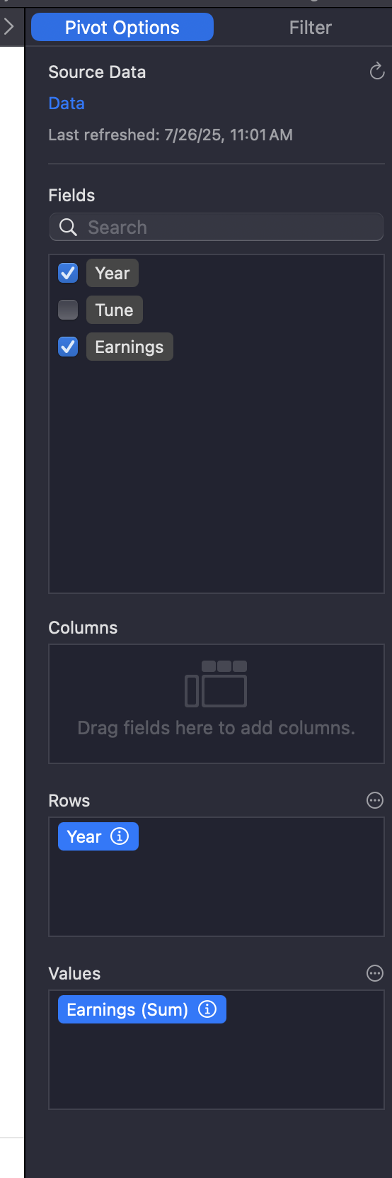 I've been unable to find a way of dragging the "Year" or "Earnings" from Tune A column into the Pivot Options. As soon as I click on the main table, the Pivot Options disappears...