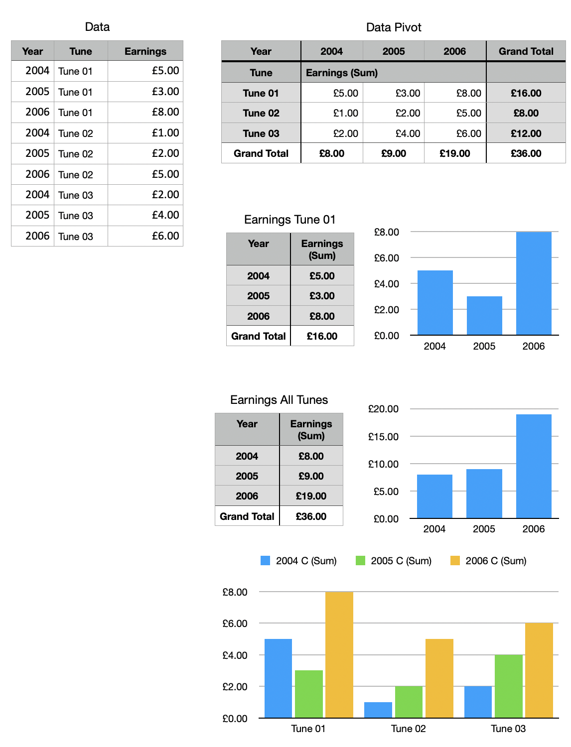 Thanks, SG. Unfortunately I failed at the second hurdle in adapting it myself (I've been unable to find a way of dragging the "Year" or "Earnings" from Tune A column into the Pivot Options. As soon as I click on the main table, the Pivot Options disappears...)