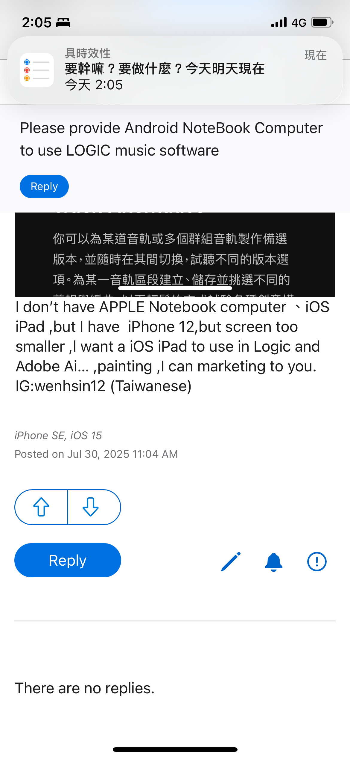 I don’t have APPLE Notebook computer 、iOS iPad ,but I have iPhone 12,but screen too smaller ,l want a iOS iPad to use in Logic and Adobe Ai… ,painting ,I can marketing to you. IG:wenhsin12 (Taiwanese)