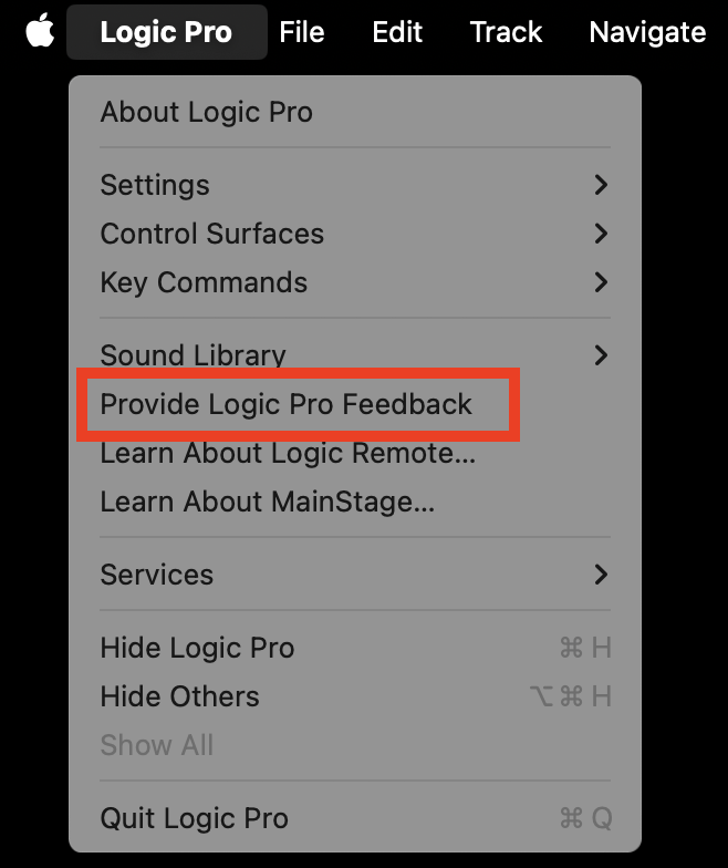 Logic doesn’t have a feedback command (that I have ever seen). I think the Apple feedback link is probably the one I’d have to use. Thanks.