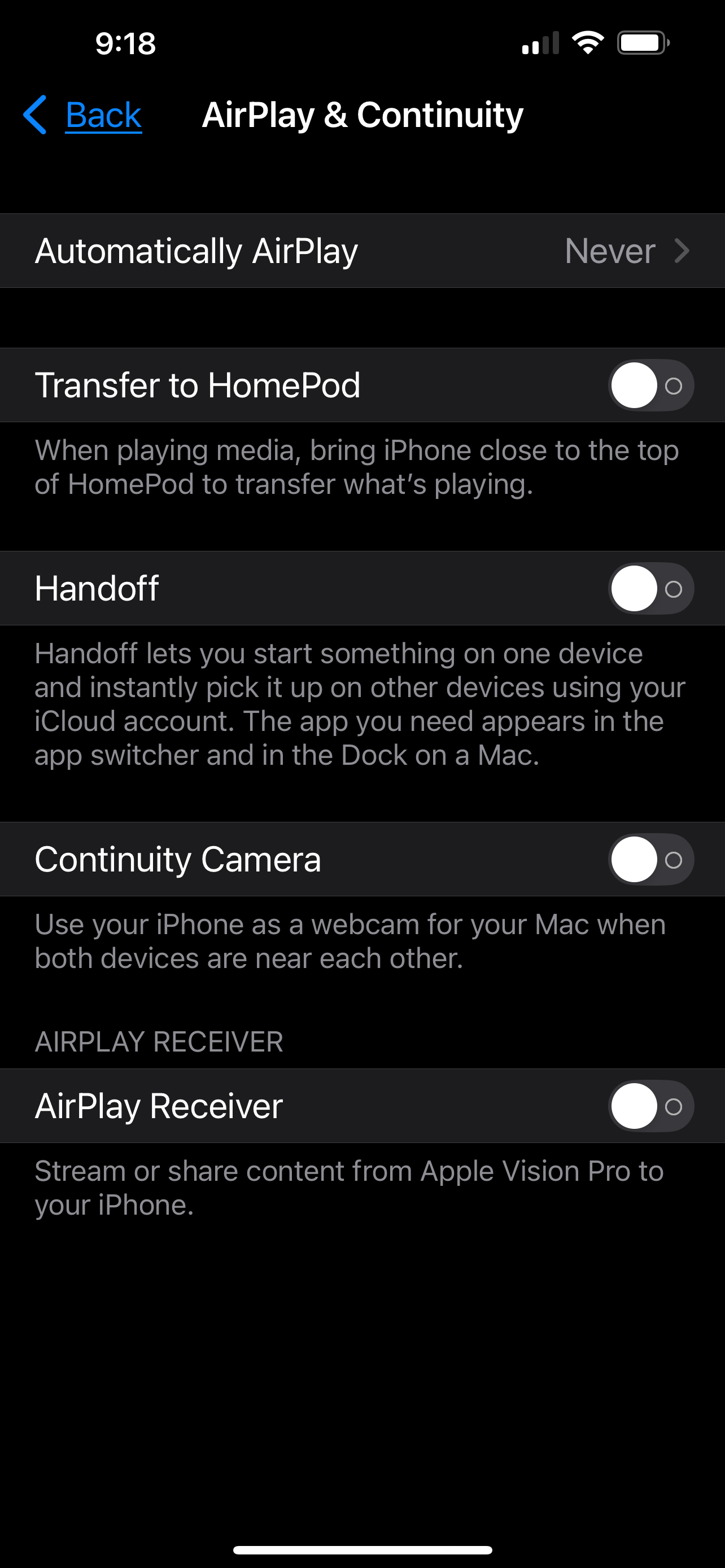 I want to turn off mirroring between my iPhone 13 ProMax (iOS 18.6.2) and my Mac Studio (Sequoia 15.6). I turned it on when I set up my new Mac Studio and now don't want it. The Apple information says for me to do it via my iPhone or on my Mac. I'm not able to do it on my iPhone because iPhone mirroring is not listed where it's supposed to be. I can't do it on my Mac because my phone is grayed out.
