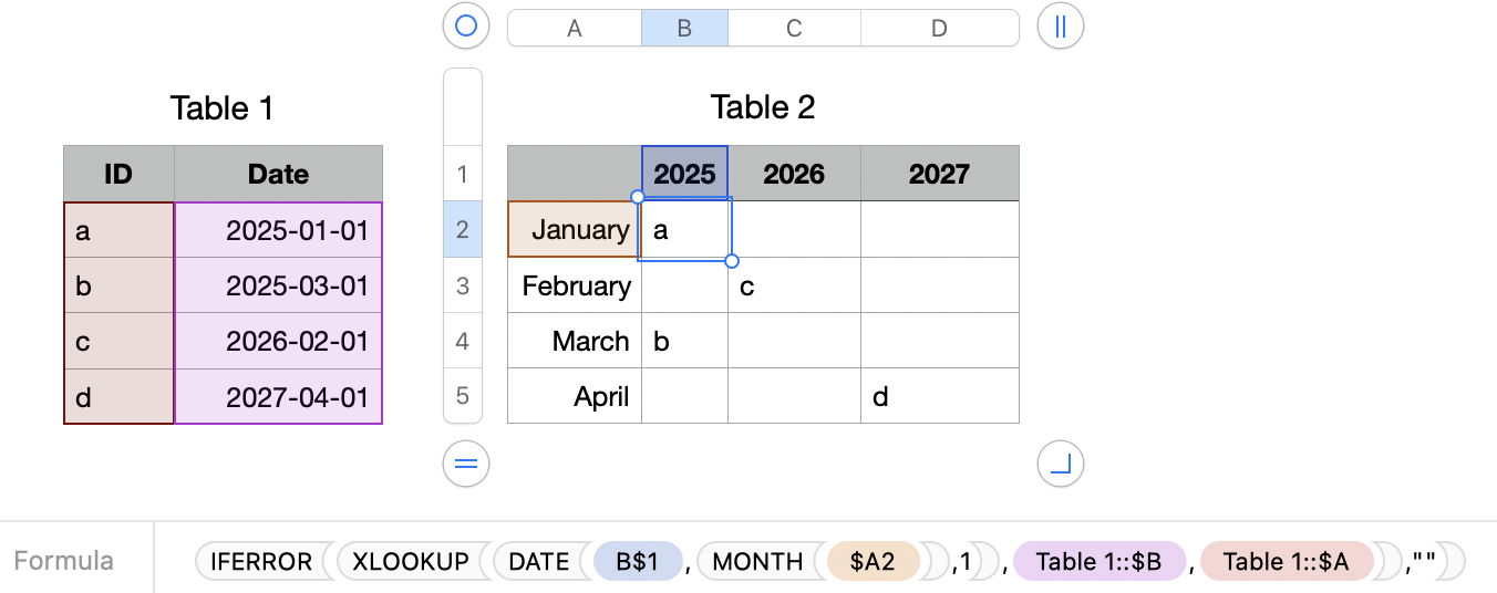 The second is a table laid out as a calendar. Col(A) is Months and Col(B) has Year {2025} (C) is {2026} etc.