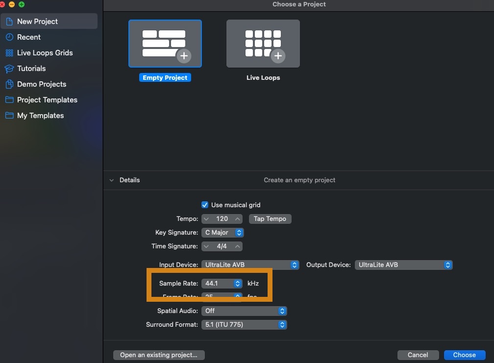 Select the Empty Project template, but set the preferred sample rate:
