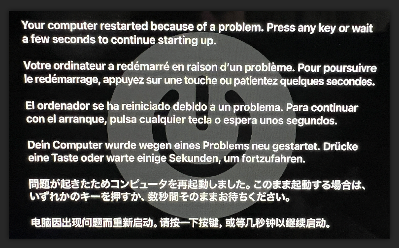 I have a Retina 5K 2019 iMac with an internal hard drive that crashed. I can now run it off an external hard drive, which has the latest Sequoia (15.6.1), and it runs fine, except when I try to restart. Every time I need to restart, I get this message: