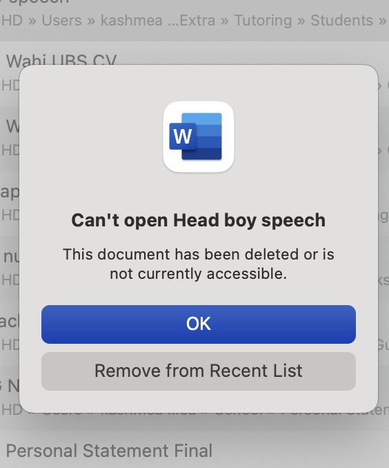 When I try and open a document directly from word, this is the message that comes up. Please could someone guide me I have all my work on it and I dont know what to do.
