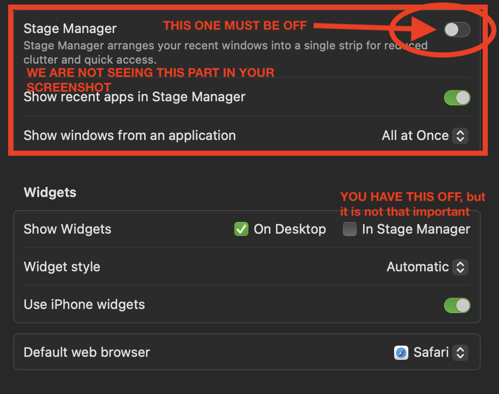 Try turning Stage Manager off - in System Settings->Dock & Desktop: