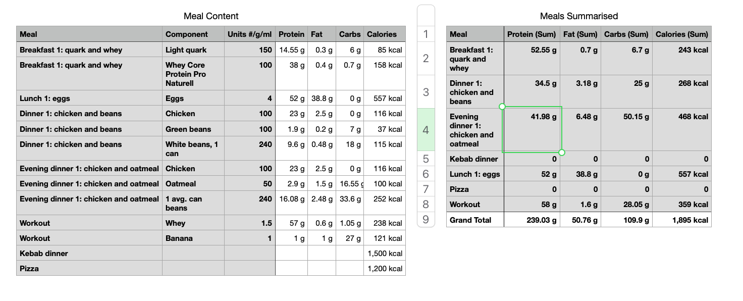 I have a pivot table with the pivot options where there’s one row (“Meal”) and Values like “Protein”, “Fat”, and “Carbs” which are columns in the pivot table.