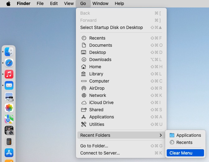 The Finder > Go menu option will clear recent Folders. To clear recent Items (i.e., files and applications that you've opened and servers that you've visited), select Apple menu > Recent Items > Clear menu.