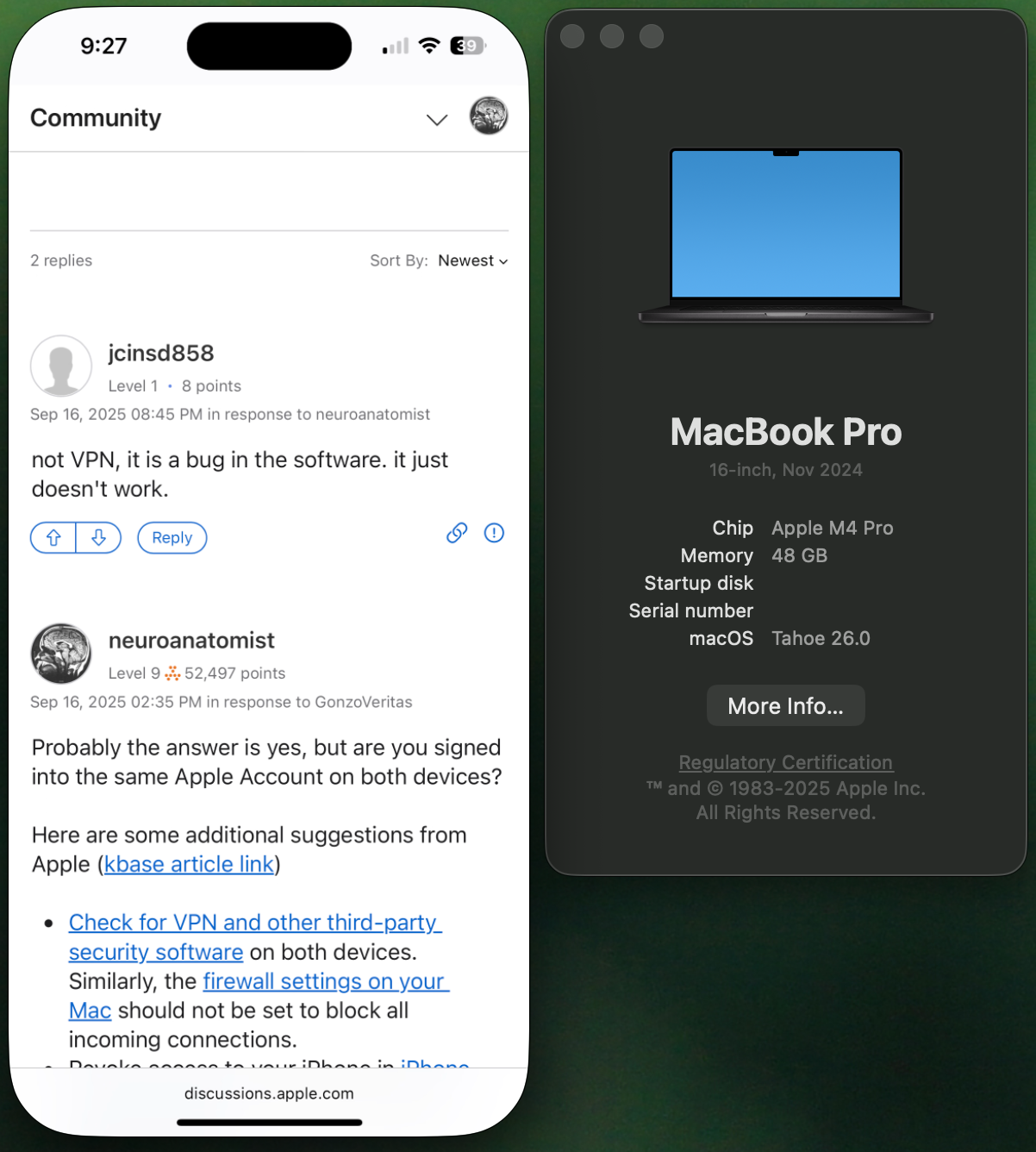 You know what’s really impressive? That ‘connection failed’ screen shows up faster than the iPhone Mirroring app can even crash on a duck. It’s instant—bam, right there. That’s how unprofessional this is. I mean, come on, at least fake it with a loading screen. Give me, I don’t know… five seconds of pretend effort before you slap me with failure. That’d be way more convincing. And hey—this tip’s free. But the next one? I’m charging. With the sheer number of bugs iOS 26 and macOS are pumping out, I’ll be a millionaire in no time.