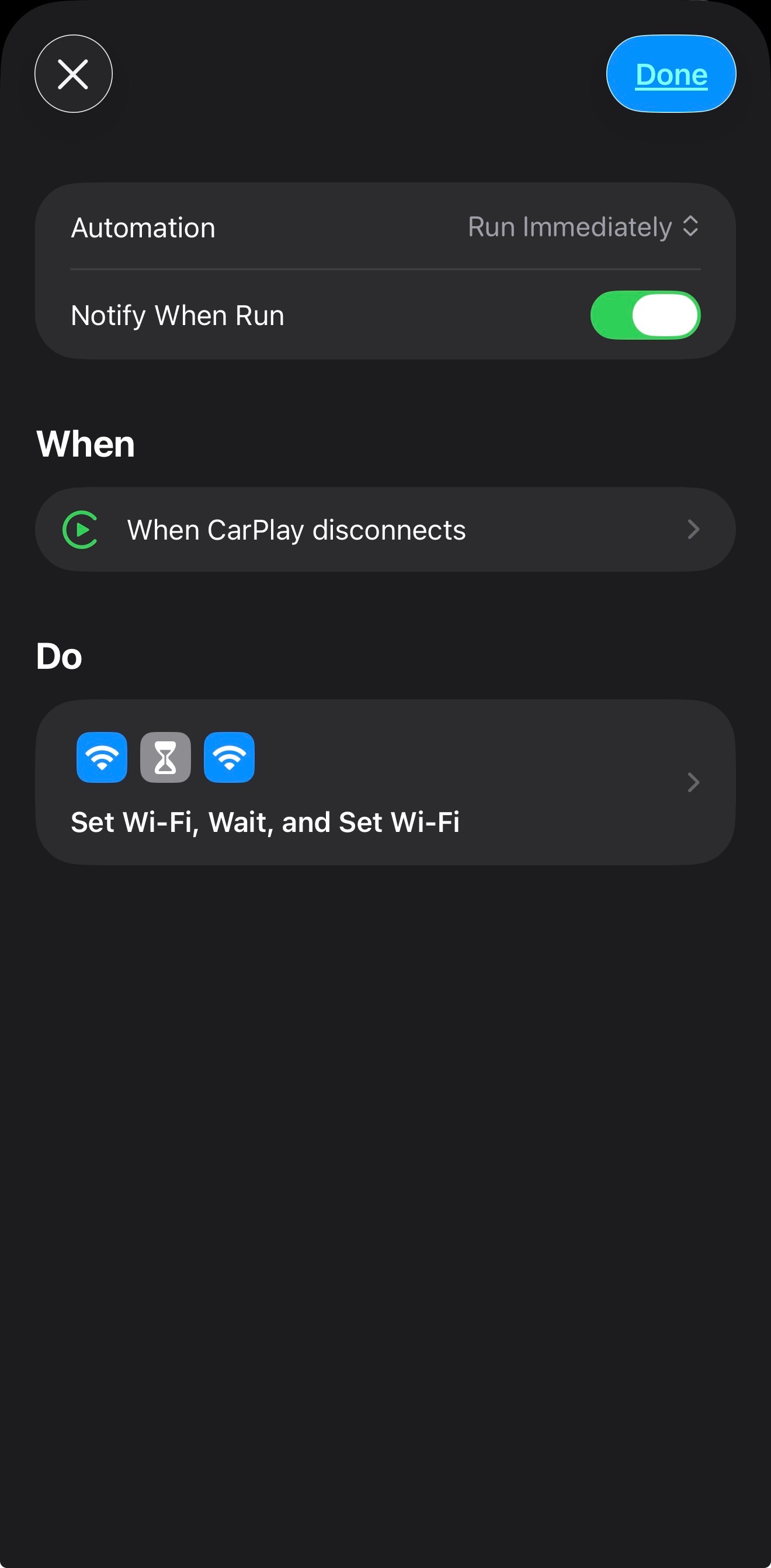 To help with maintain a connection I have created an automation in the shortcuts app that restarts my WiFi when CarPlay disconnects. This is also helped me somewhat debug the issue. What I’ve noticed is this seems to be related to when the phone switches cell towers as I live in a fairly mountainous region I lose my carplay connection at around the same areas the phone should be switching cell towers. That being said, I don’t think the cell towers are the actual cause but point to a bug in Apple‘s code that causes a small Wi-Fi glitch when cell towers are being switched.