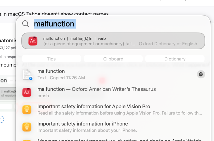 Original Title: Searching via Spotlight for a Contact name doesn't return the contact card in MacOS Tahoe