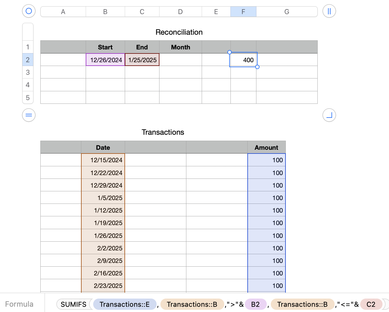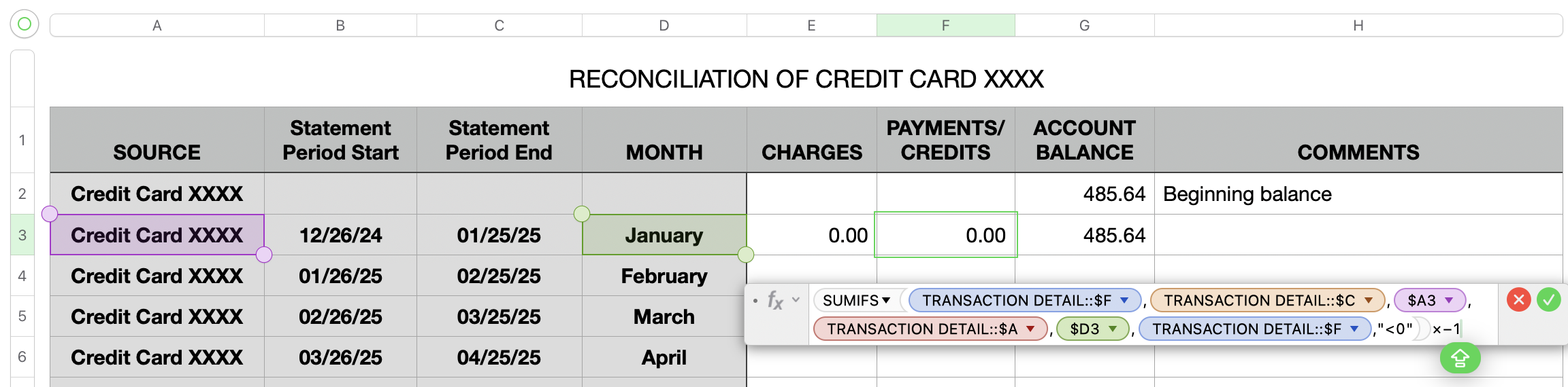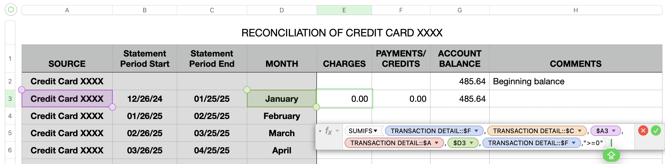I post all my financial transactions in one sheet. In a separate sheet I want to reconcile the credit card charges to the statement by capturing the transaction amounts by statement period. Currently I am capturing the data by month, but want to modify the formula to the date range. Here is what I have: