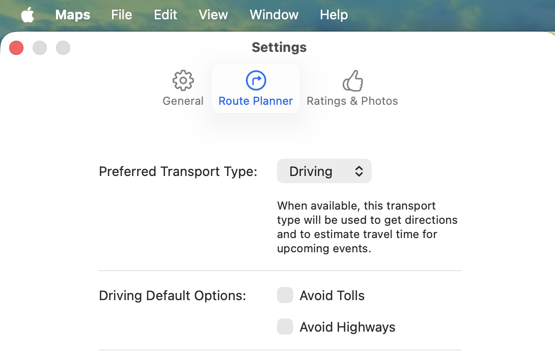 Maps defaulting to 'Walking' instead of 'Driving' on iMac