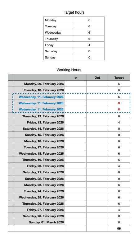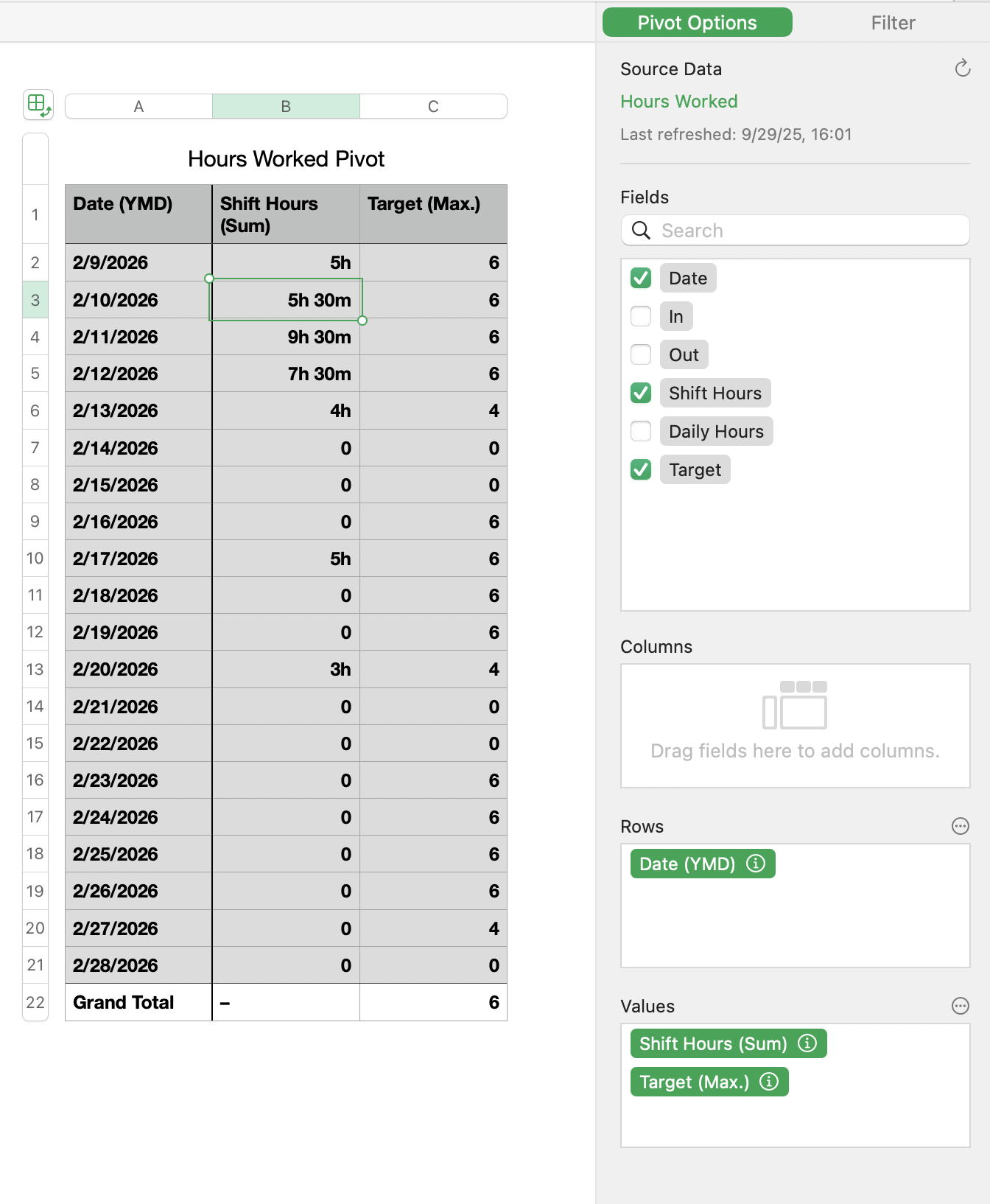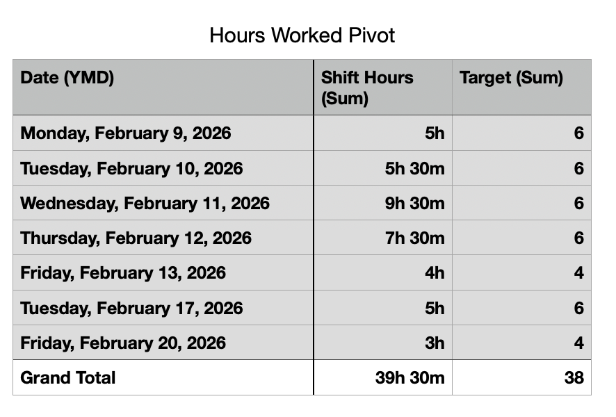 From here it should be easy to add another column that compares the Daily Hours with the Target hours and flag any days that are over/under, but that's a separate project :)