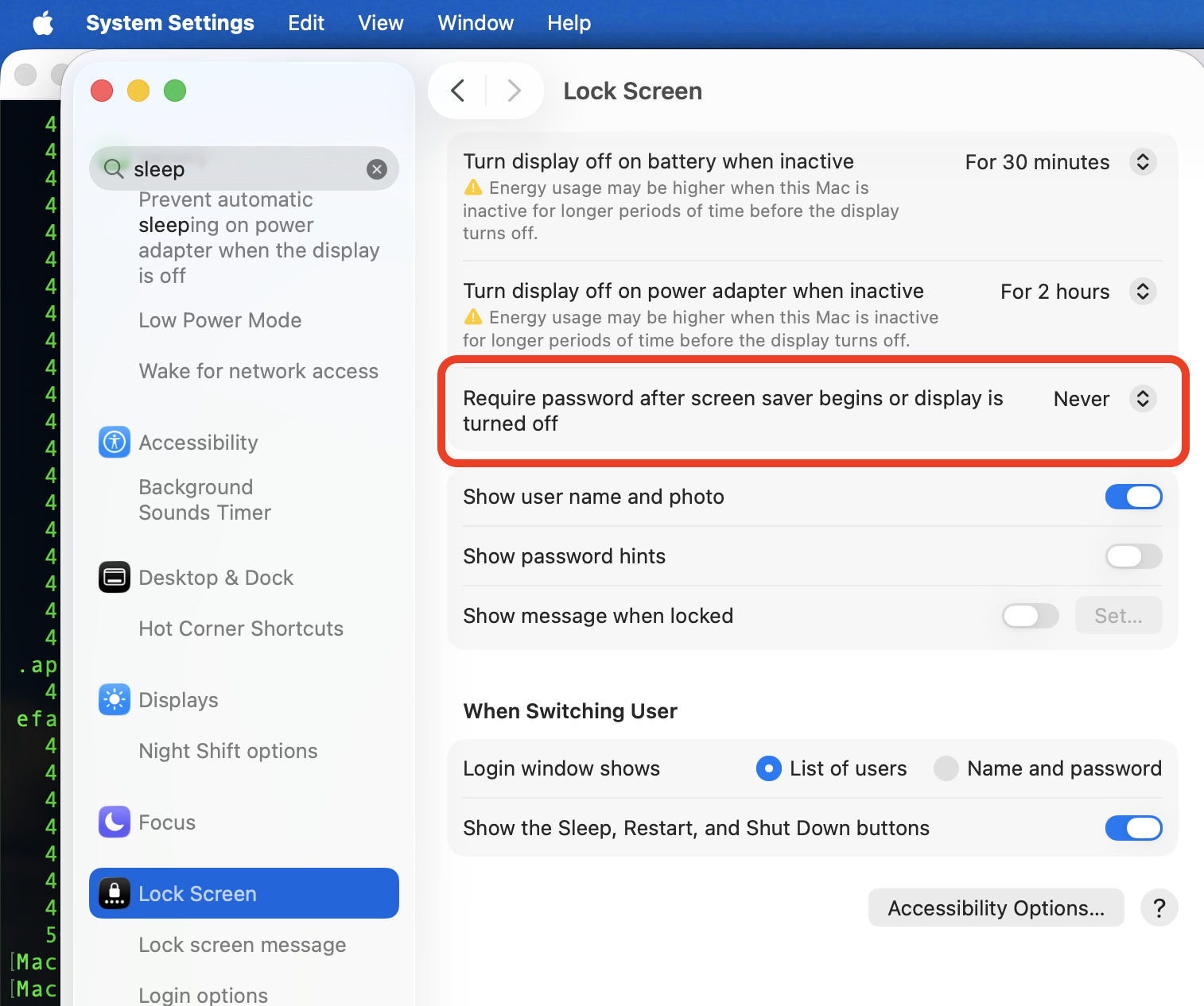 @leroydouglas i think you got it. i had iphone mirroring (which I don't even use) set to automatically authenticate, which was requiring the laptop to force a password every time. the option to do "Never" was disabled as a result: