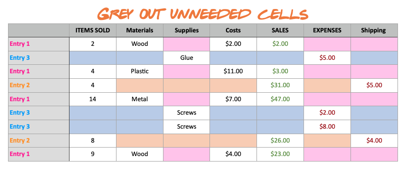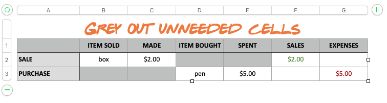 Your current design is keyed off the first column being either SALE or PURCHASE. You're then trying to guide the user to enter values in relevant fields by highlighting (or de-highlighing) the fields in question.