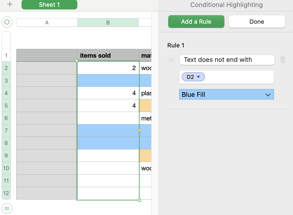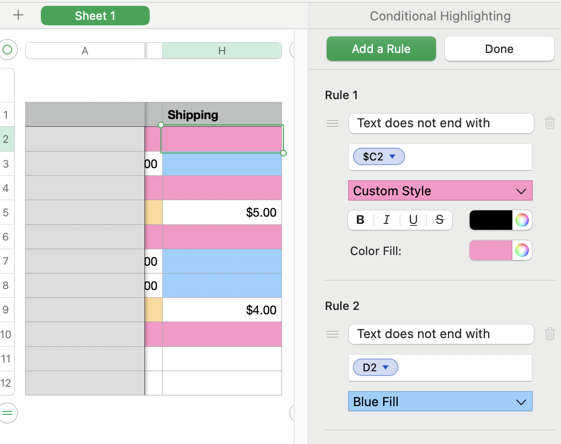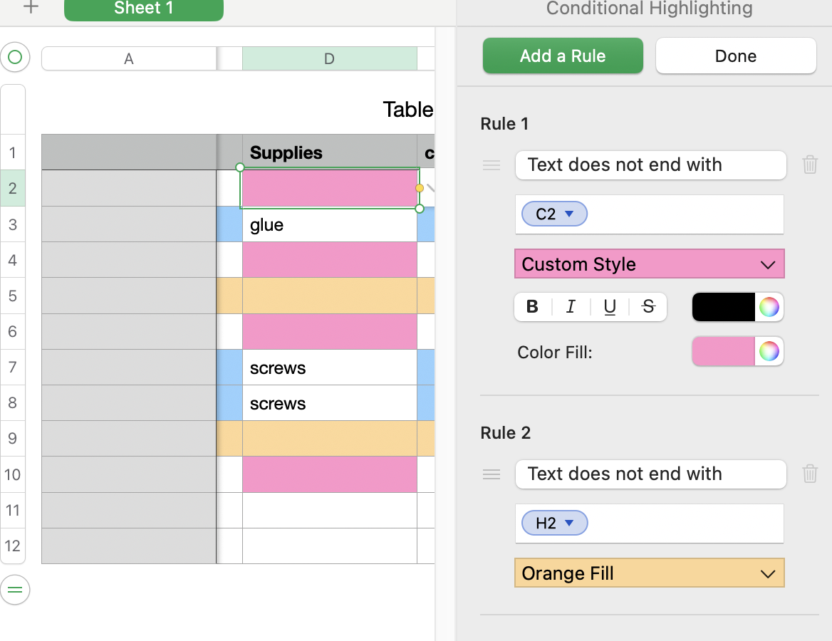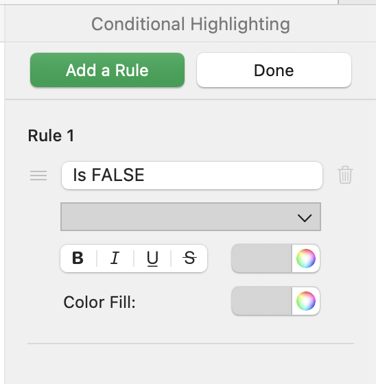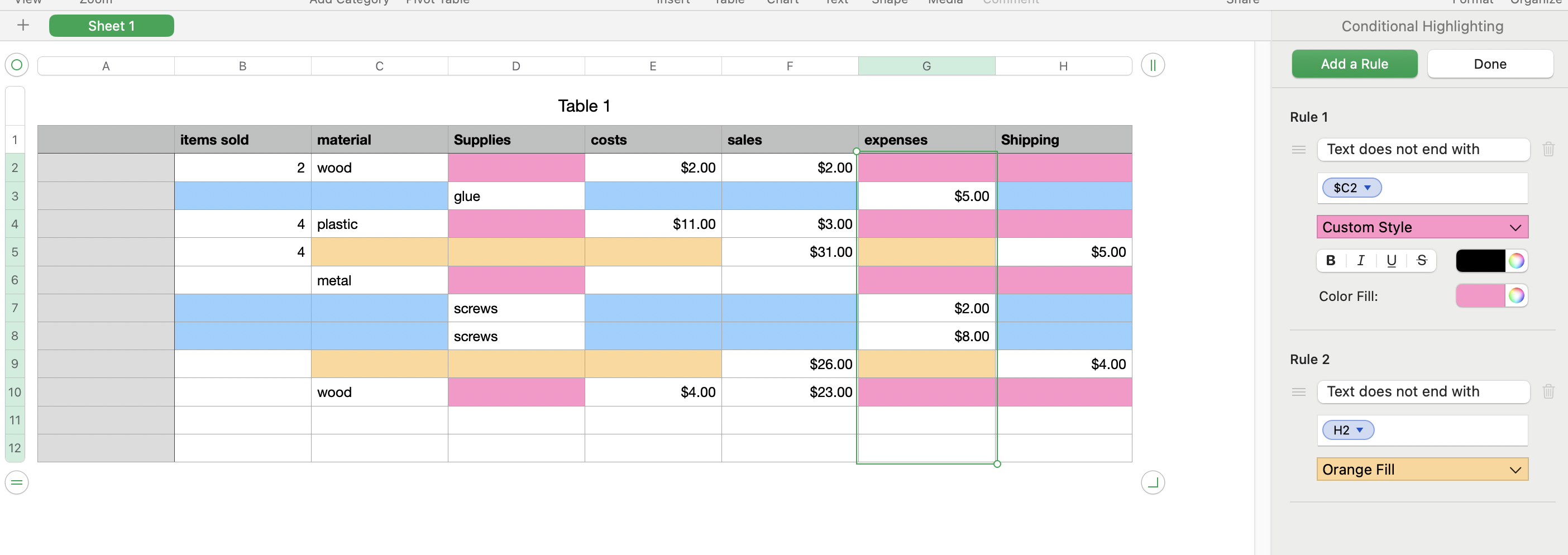 Now all you need to to is add one conditional highlight to the entire table (or, at least columns E-K) that hides the values (based on setting the background and text colors the same):
