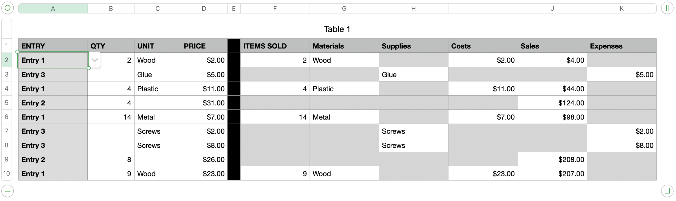 In this way, column A is used as a trigger to determine whether a value should be shown in the corresponding column or not.