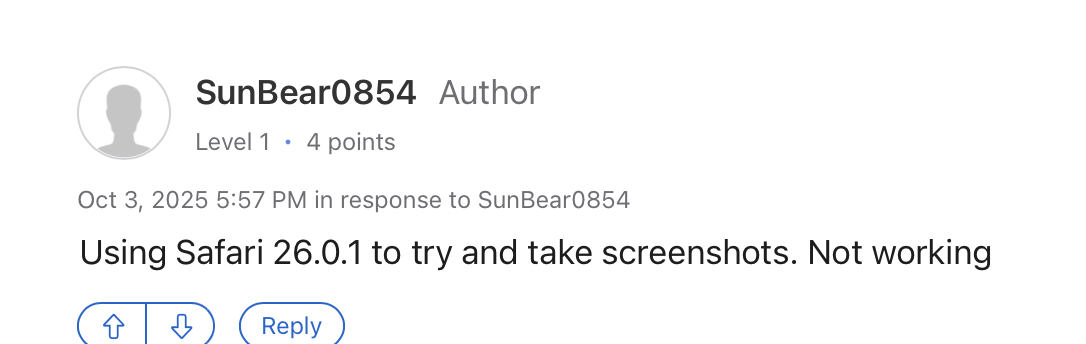 Using Safari 26.0.1 to try and take screenshots. Not working
