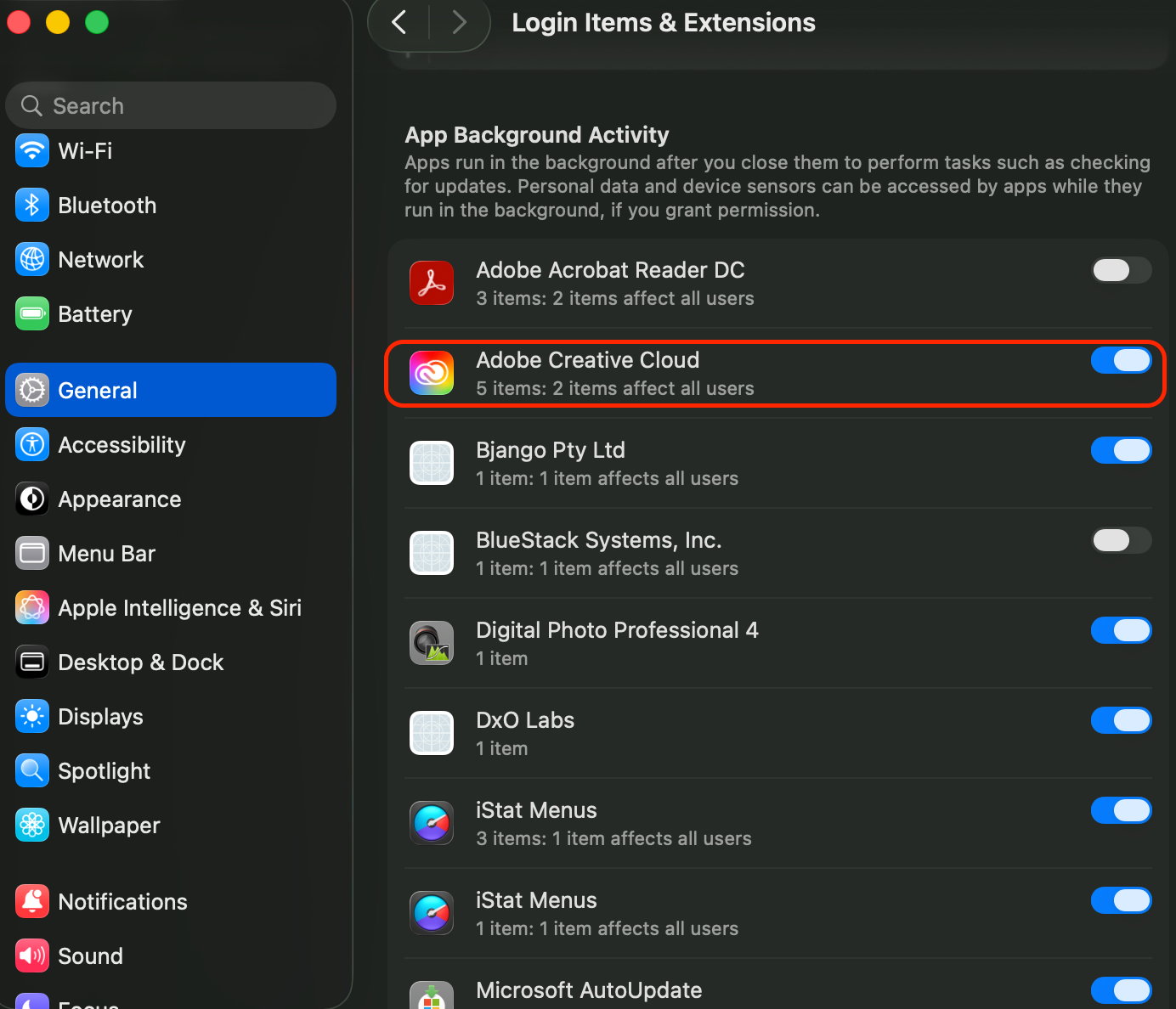 Solution Find: Turn OFF Adobe Creative Cloud and Adobe Inc. in System Settings > General > Login Items & Extensions > App Background Activity