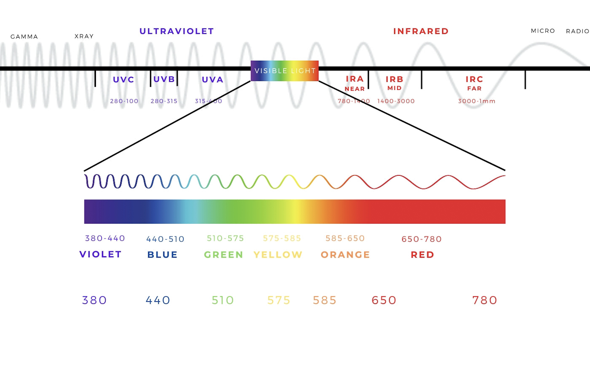 Here is a basic spectrum showing the various wavelengths of light, including visible light.