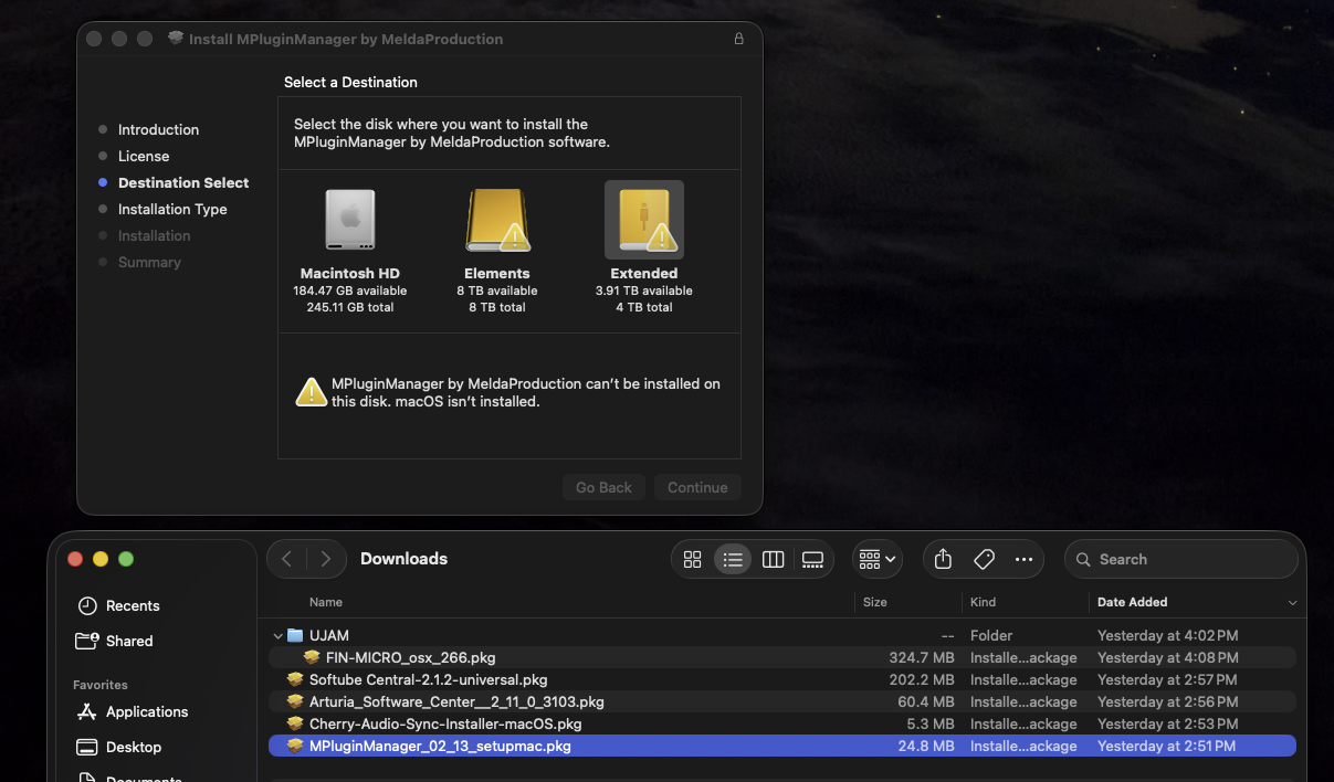 When I attempt to install MeldaProduction or the Arturia software centers on an attached thunderbolt M2 drive, I see the message that it can't install there because MacOS isn't installed there. I tried formatting as MacOS extended to no avail. I am new the Apple ecosystem, and am likely not using the correct language in my searches. My system is the entry M4 mini, with an Acasis M002Pro dock with a pair of 4tb 990 pro as individual volumes. I was able to put Logic and all its sound banks on one of the drives from the App Store.