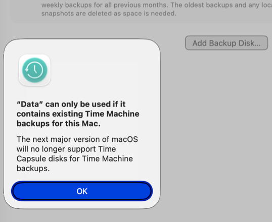 However, devices running macOS Tahoe 26.x cannot back up to a newly formatted / erased Time Capsule in any circumstance--even if that same device ,running the same version of macOS Tahoe 26.x, was successfully backing up to that same Time Capsule before that Time Capsule was formatted / erased! Thus, for any reader who is running macOS Tahoe 26.x and is receiving an error message that there is not enough space to back up their new device to Time Capsule, you must find a solution that does not involve formatting or erasing the Time Capsule.