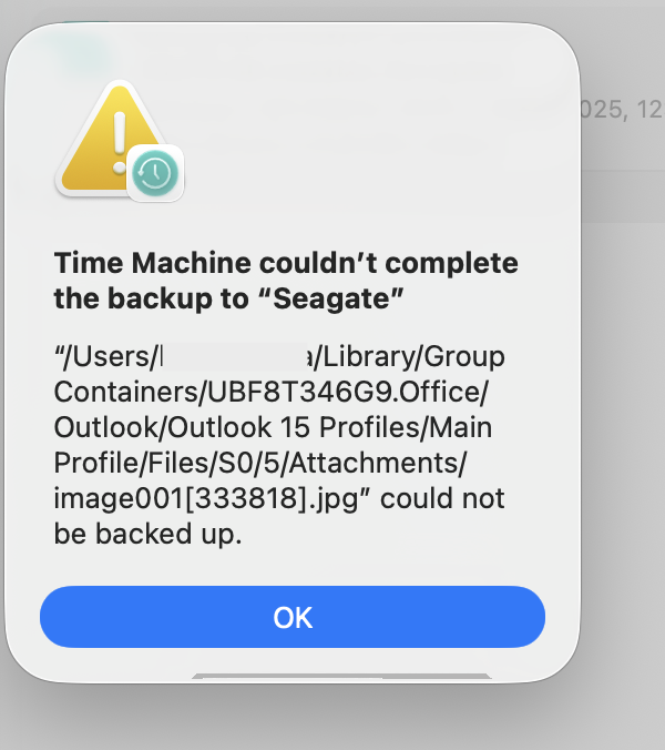 Time Machine is unable to complete backup. Any suggestions on how to work past this error?
