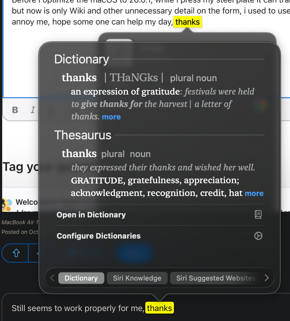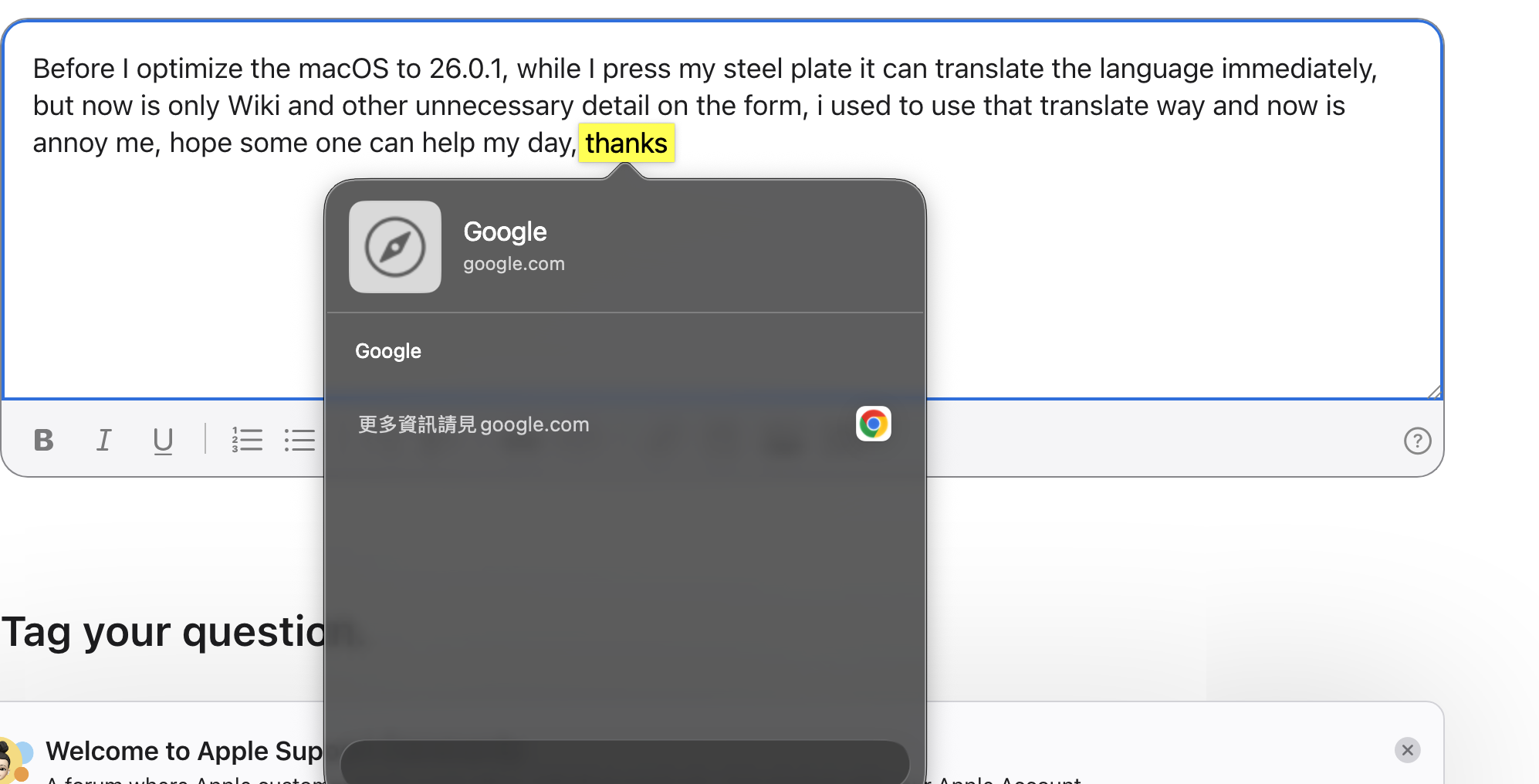 Before I optimize the macOS to 26.0.1, while I press my steel plate it can translate the language immediately, but now is only Wiki and other unnecessary detail on the form, i used to use that translate way and now is annoy me, hope some one can help my day, thanks, the attachment show there is no translate function.