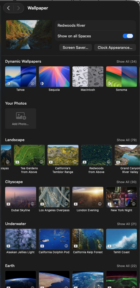Wallpaper settings in macOS Tahoe 26.0.1 is missing the ‘Add Your Own Photos’ option