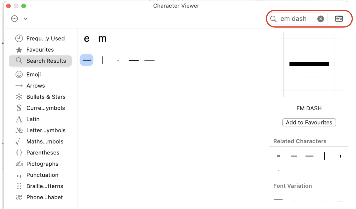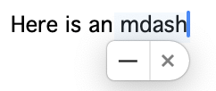 Now, when you are typing and want to insert either character, you enter the word ndash or mdash, and a pop-up will float over that location showing the respective dash character and an x (to cancel it). Type any character other than the Esc (also a cancel action) or return key, and the respective dash symbol will be inserted for you.