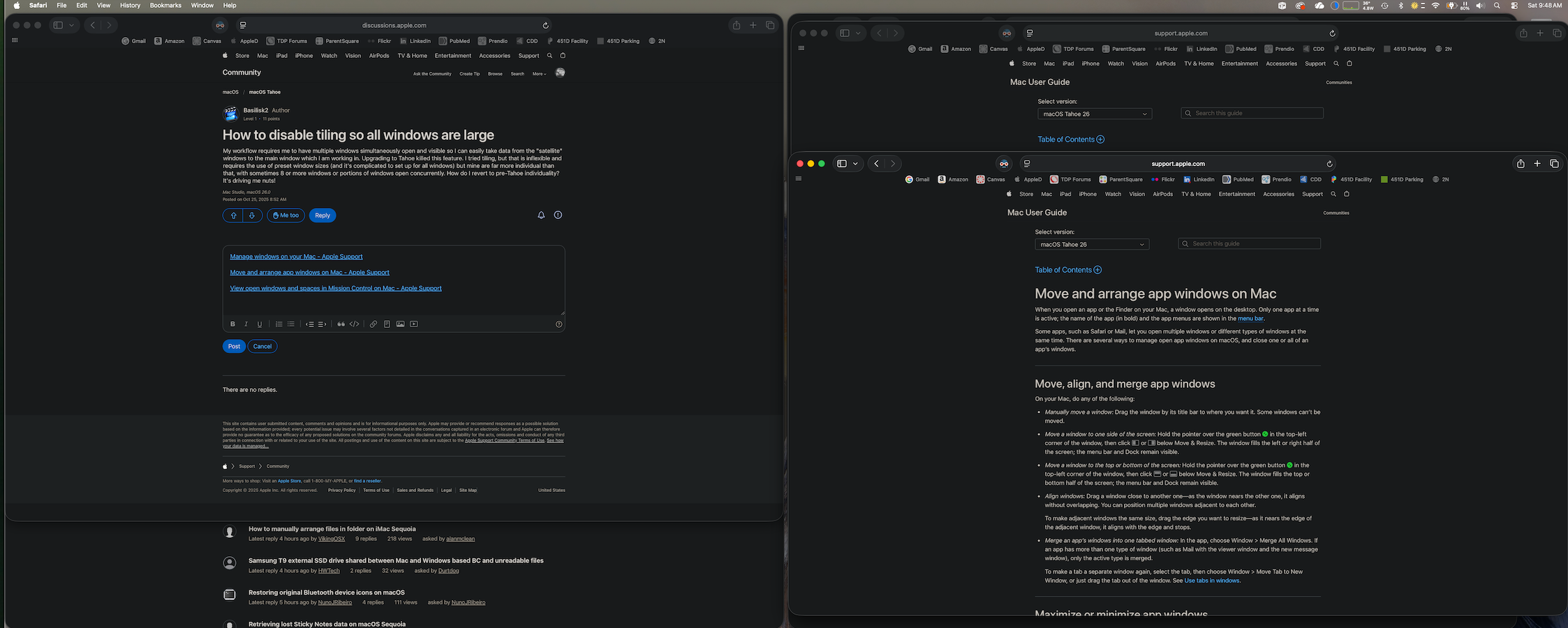 My workflow requires me to have multiple windows simultaneously open and visible so I can easily take data from the "satellite" windows to the main window which I am working in. Upgrading to Tahoe killed this feature. I tried tiling, but that is inflexible and requires the use of preset window sizes (and it's complicated to set up for all windows) but mine are far more individual than that, with sometimes 8 or more windows or portions of windows open concurrently. How do I revert to pre-Tahoe individuality? It's driving me nuts!