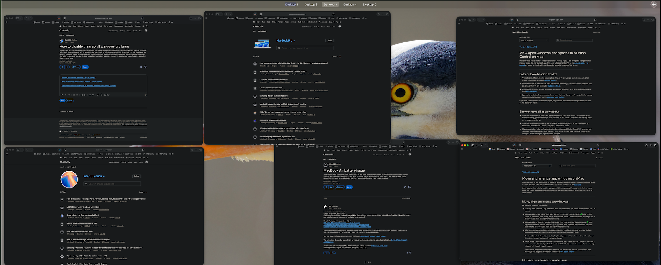 Example of the 6 Safari windows I have open on this desktop: