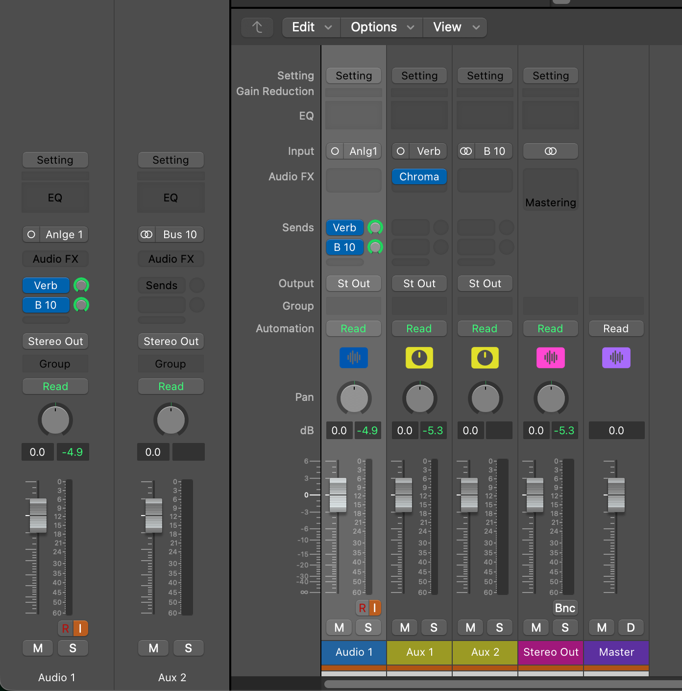 I create a send to an aux channel and set the send output. The aux channel is created and I set it to a bus I have names as Verb. I have a reverb plugin inserted. The output is set to stereo 1-2.