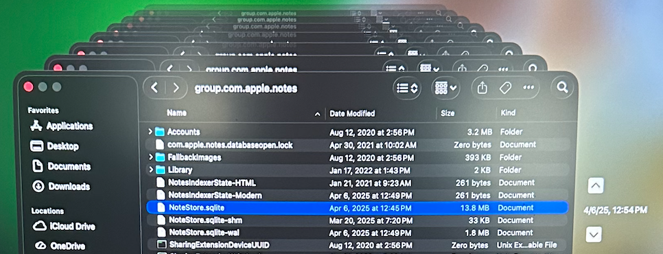 • I’ve checked the local Notes database file (~/Library/Group Containers/group.com.apple.notes/NoteStore.sqlite) and even though it’s around 7 MB in size, the missing note is not there.