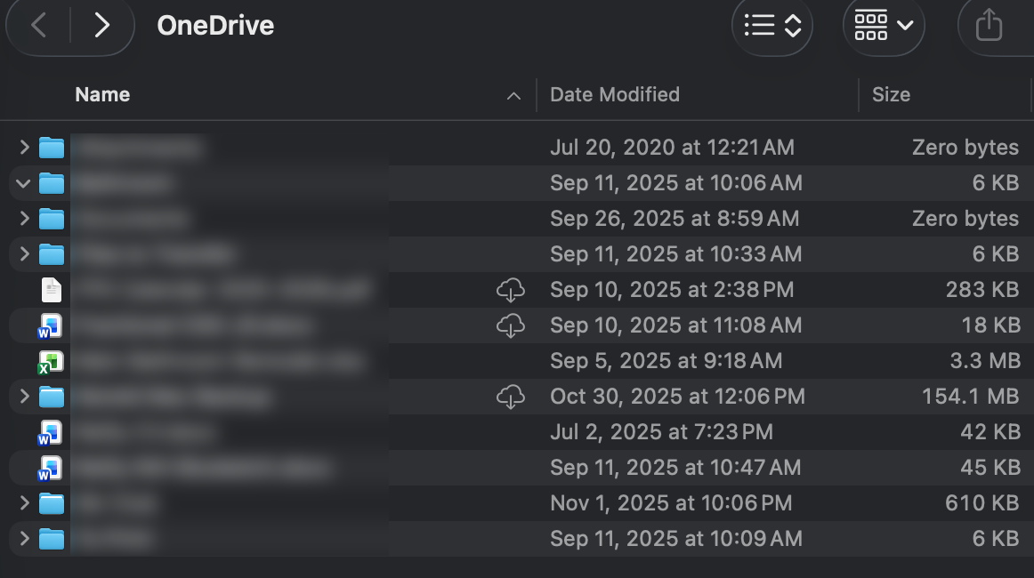 Regarding the space, OneDrive does not necessarily keep everything on your local storage. The little cloud icon next to a file/folder means that item is not local, only on the OneDrive server. In my case, that applies to the largest item (a 151 MB folder):