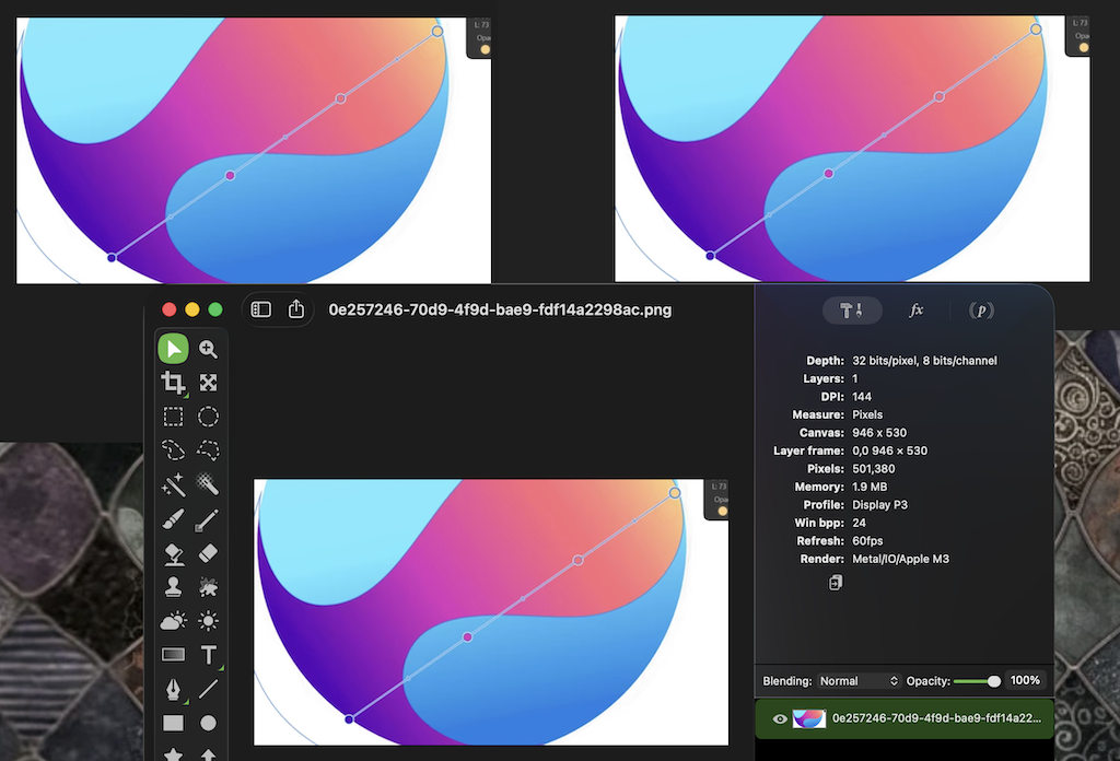 Hello. I am a graphic designer and recently I updated to macOS Tahoe. While working on a project in Affinity Designer 2, I took a screenshot of the gradient colors to use for my project (Image 1). When I opened it in Affinity Designer 2, the screenshot was blurry and sometimes unusable (Image 2). Is there a way to fix this or is this a glitch? Any help would be appreciated.