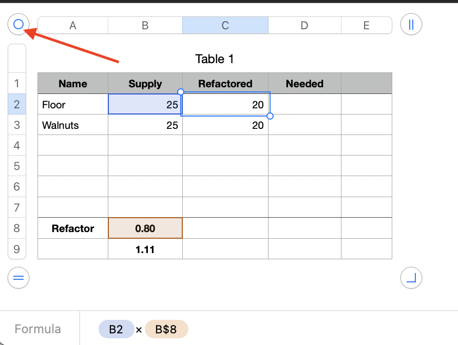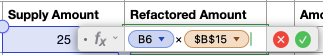 The cells in the red block, C6-C13, depend on the values on their row in Column B. But they also all use the number in B15. I created the formula in C6 that looks like this: