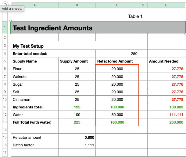 I'm making a spreadsheet for some of my hobby projects. For now, the ingredients listed make it look like a recipe. That's just temporary while I work things out, so if the ingredients don't make sense, or it doesn't make sense why I'm adding water, just figure it's how my project works.