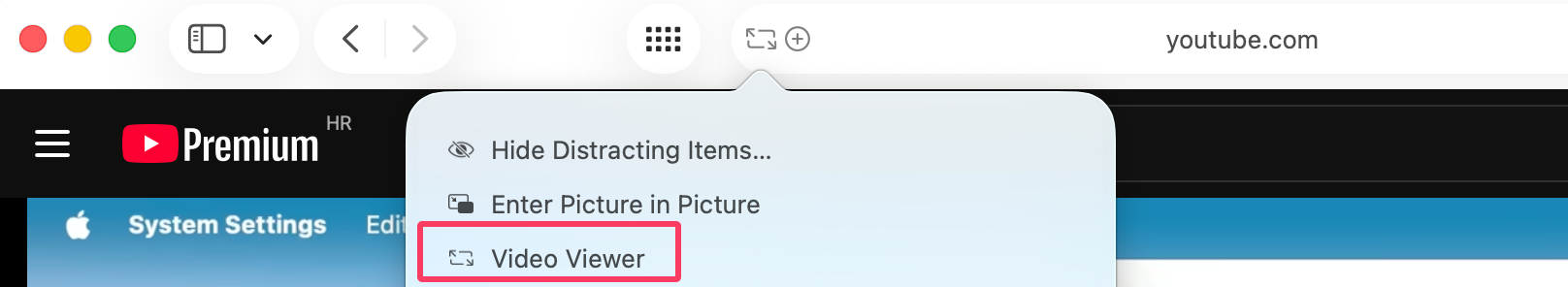 Open Safari, go to Youtube and start video playback. Click on Video viewer: