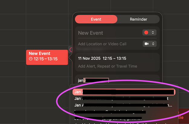 Hello, when adding invitees to an event, Apple Calendar always shows me a list of suggested contacts. However, many of these are old contact addresses that have changed, and it doesn't seem to 'remember' any of the new addresses I enter. For example, it keeps suggesting my work email from a previous job, which isn't even saved in my Contacts app anymore. But won't suggest my current work address, which is saved in the Contacts app.