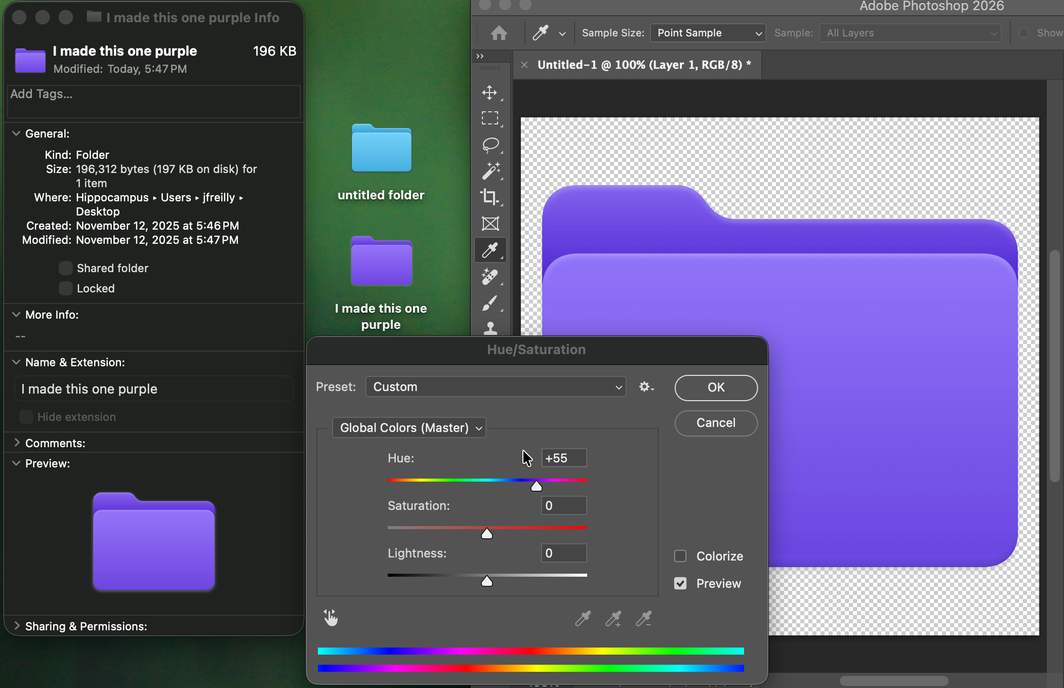 But...the only way to choose a specific folder color is with a tag. That's shown in the Customize Folder option, where you can see it's linked to the set of tags. The tags shown below are the 'Favorite Tags' in the Finder settings screenshot above, and if you remove all of the Favorite Tags, then the option to Customize Folder also disappears.