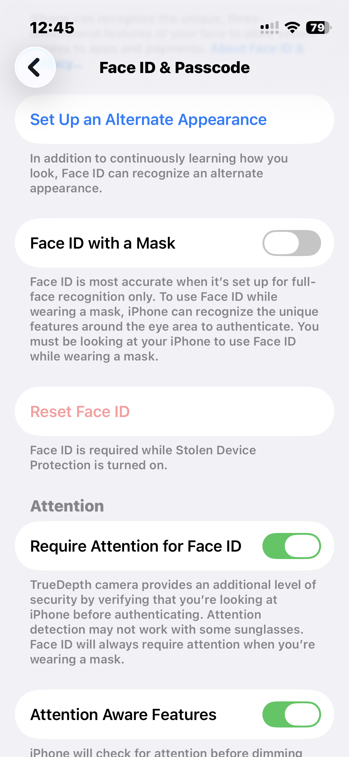 8) Try Set Up Face ID again. This time the link took me to where you get the frame to capture your face and move it around. Same result as with Alternate Appearance (above #4) followed instructions, and it never got past the screen with the frame.