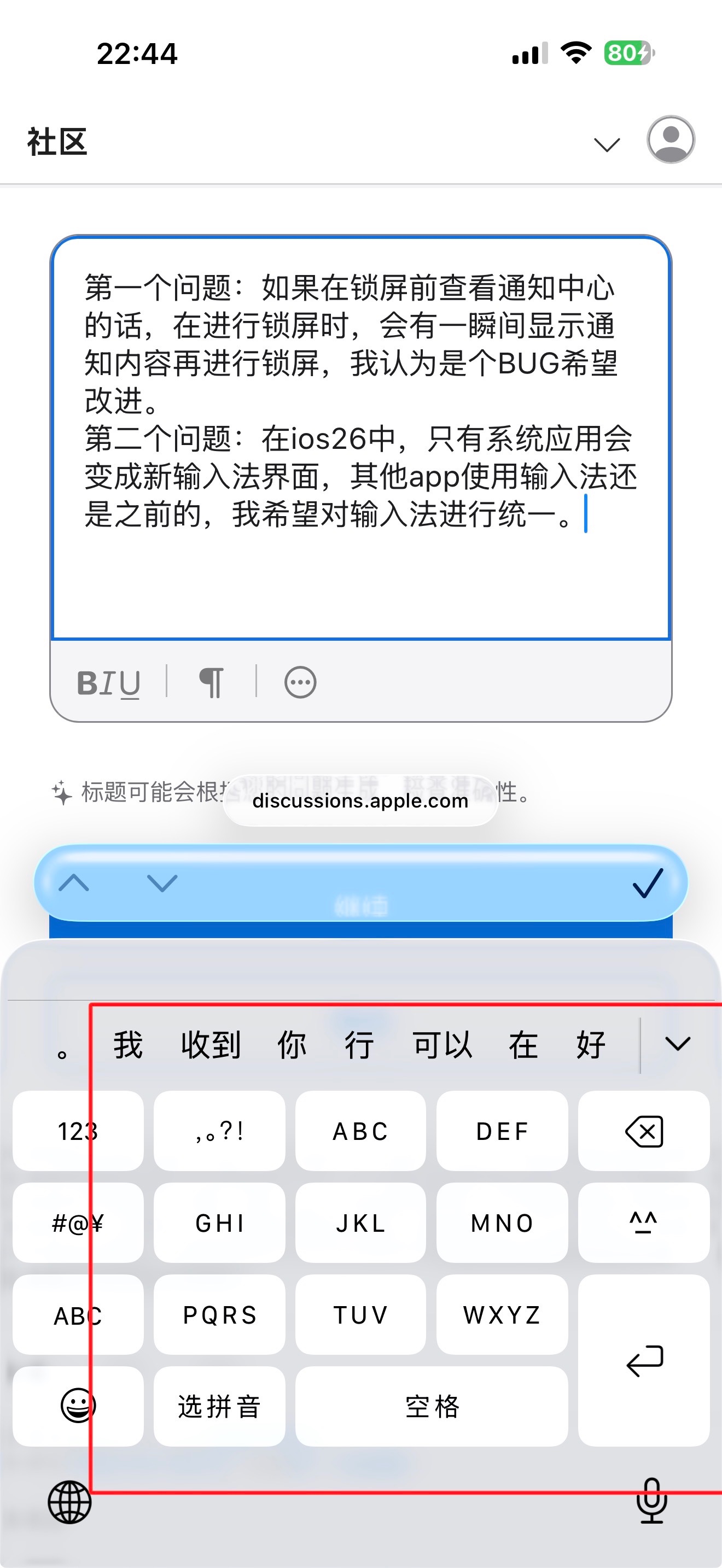 第二个问题:在ios26中,只有系统应用会变成新输入法界面,其他应用程序使用输入法还是之前的,我希望对输入法进行统一。