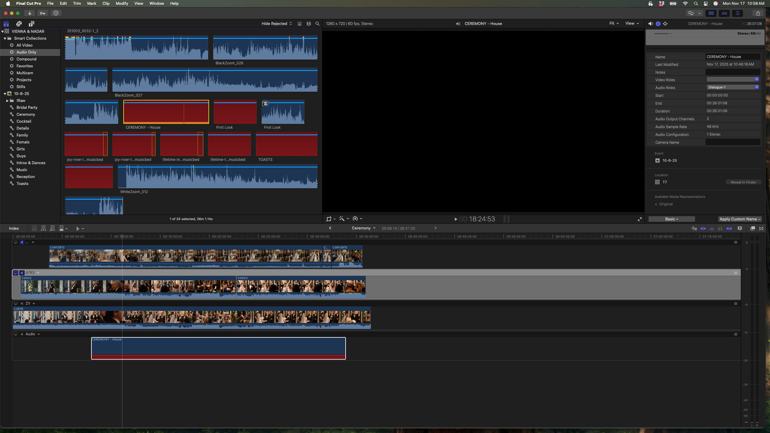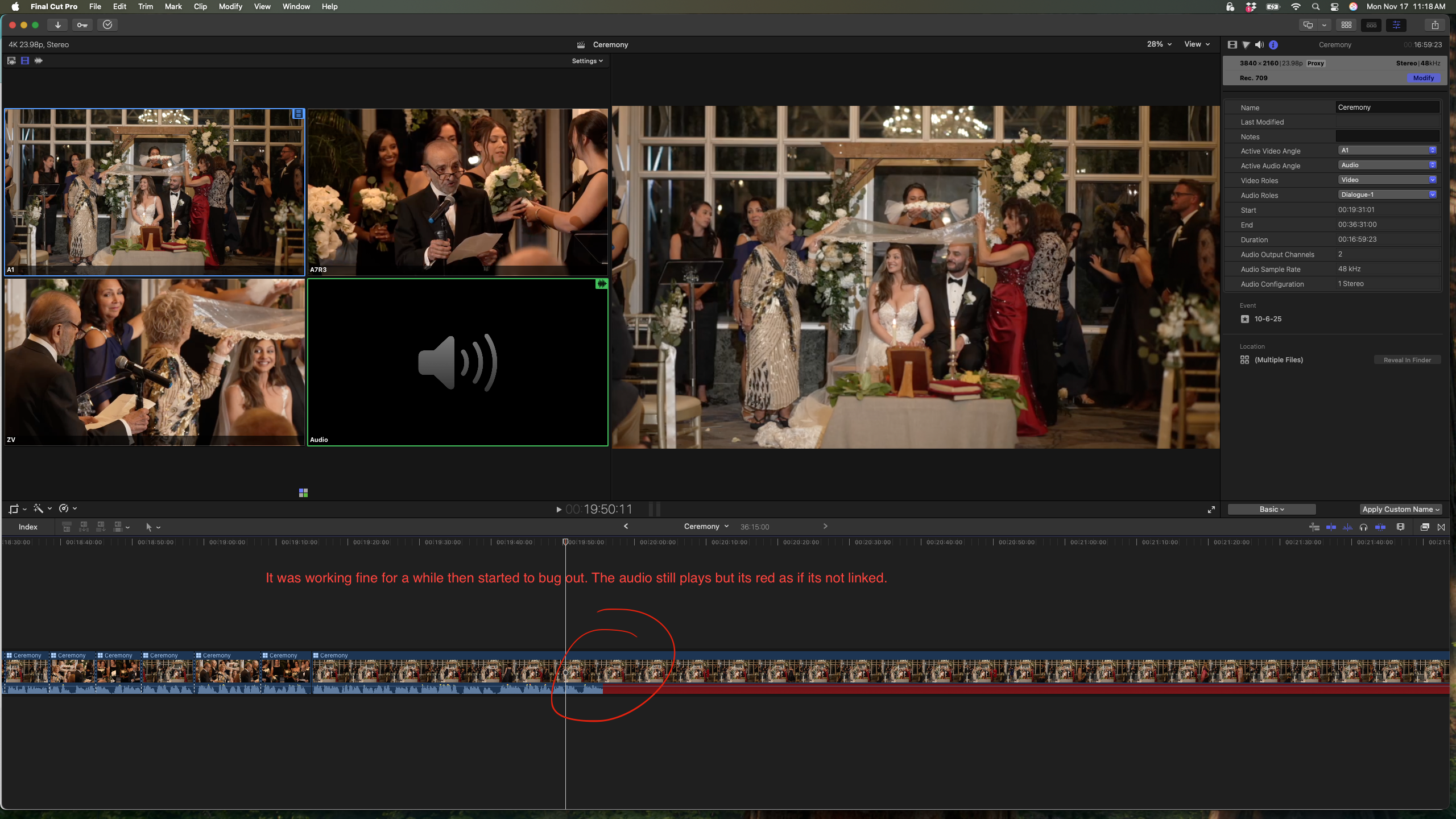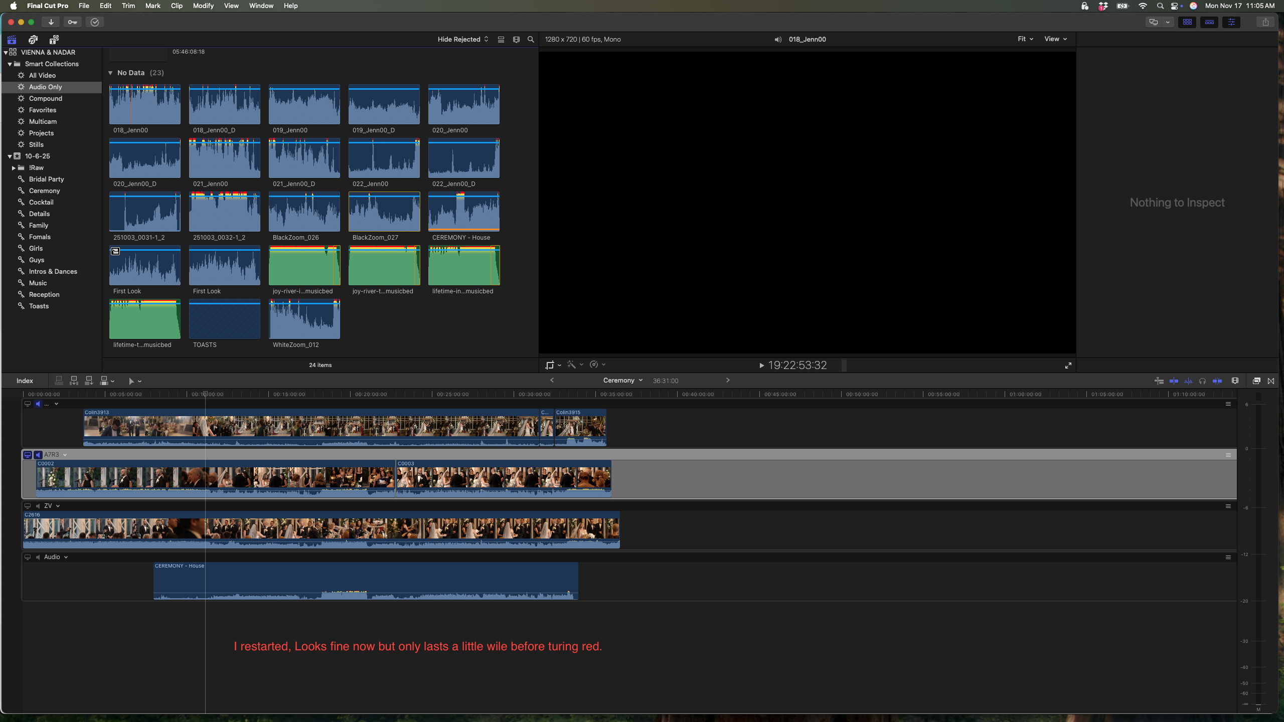 I have Audio clips in Final Cut that are RED as if they are not linked and I can't see the waveforms. The audio is there and will play. Occasionally, when I start or restart FCPX they will look fine and then turn red. Ive relinked the files 100 times and that doesn't work. The files themselves are stereo WAV 48k files that I made, and some are downloads straight from Musicbed. I tried trashing all the render files, but that didn't work either. It doesnt seem to matter if im working in proxy or optimized.