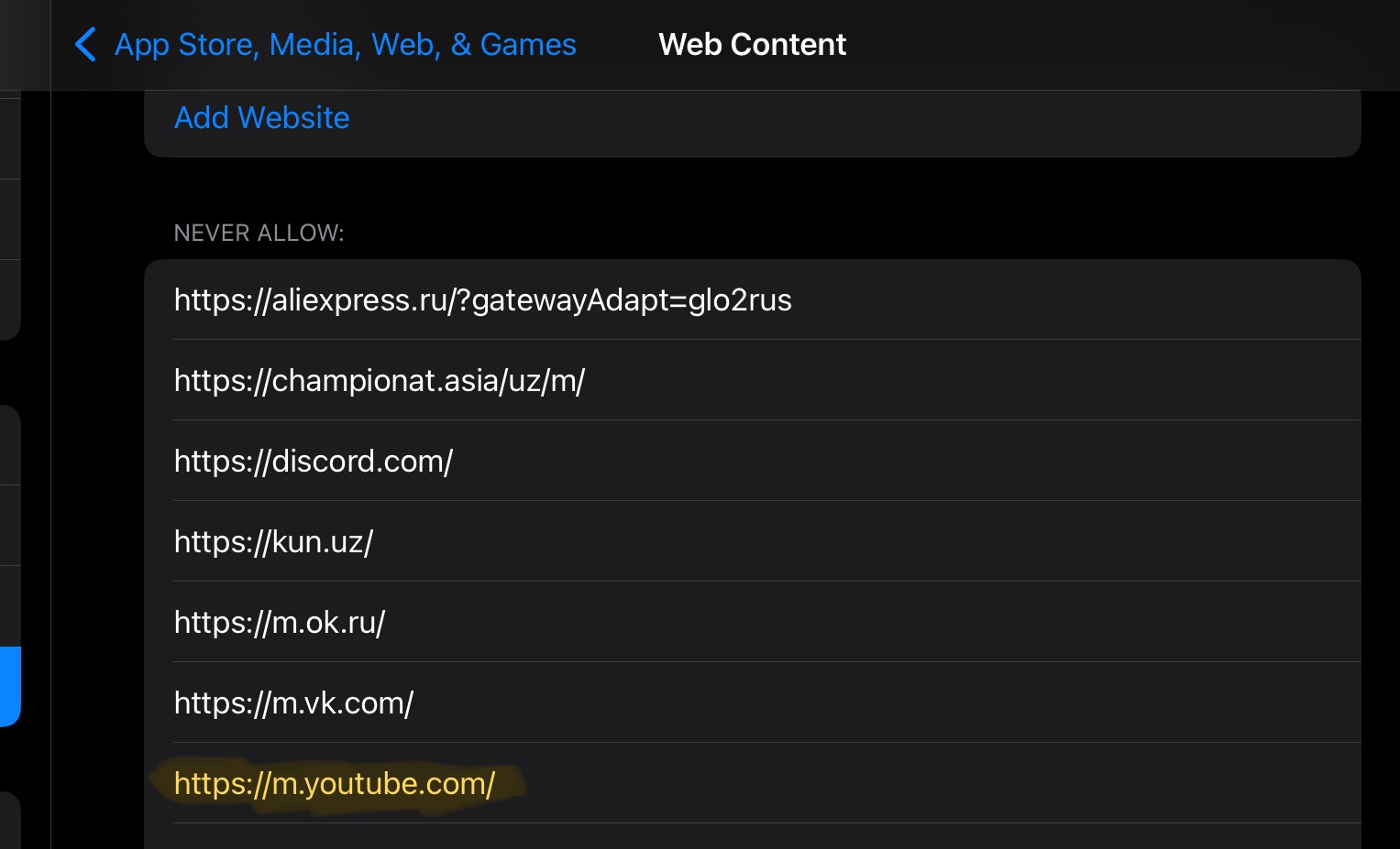 I banned youtube website from Screen time-> Content & Privacy Restrictions-> App store,Media,Web & Game-> Web content👇And how u can see it still work on safari however in another browsers not👇