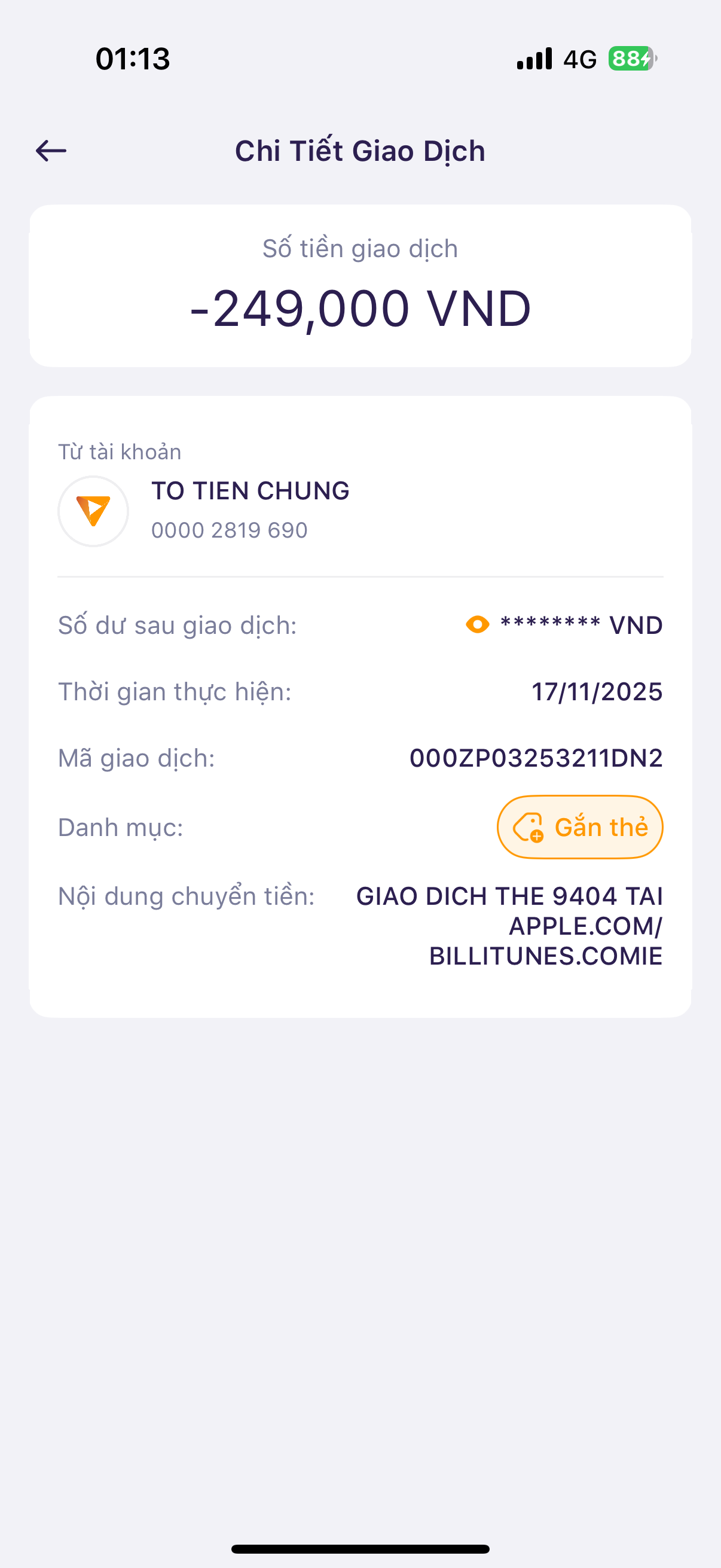 Hôm nay mình bị trừ tiền với nội dung "GIAO DICH THE 9404 TAI APPLE.COM/BILLITUNES.COMIE" trong khi mình không sử dụng dịch vụ này. Đề nghị hoàn tiền lại tài khoản cho mình.